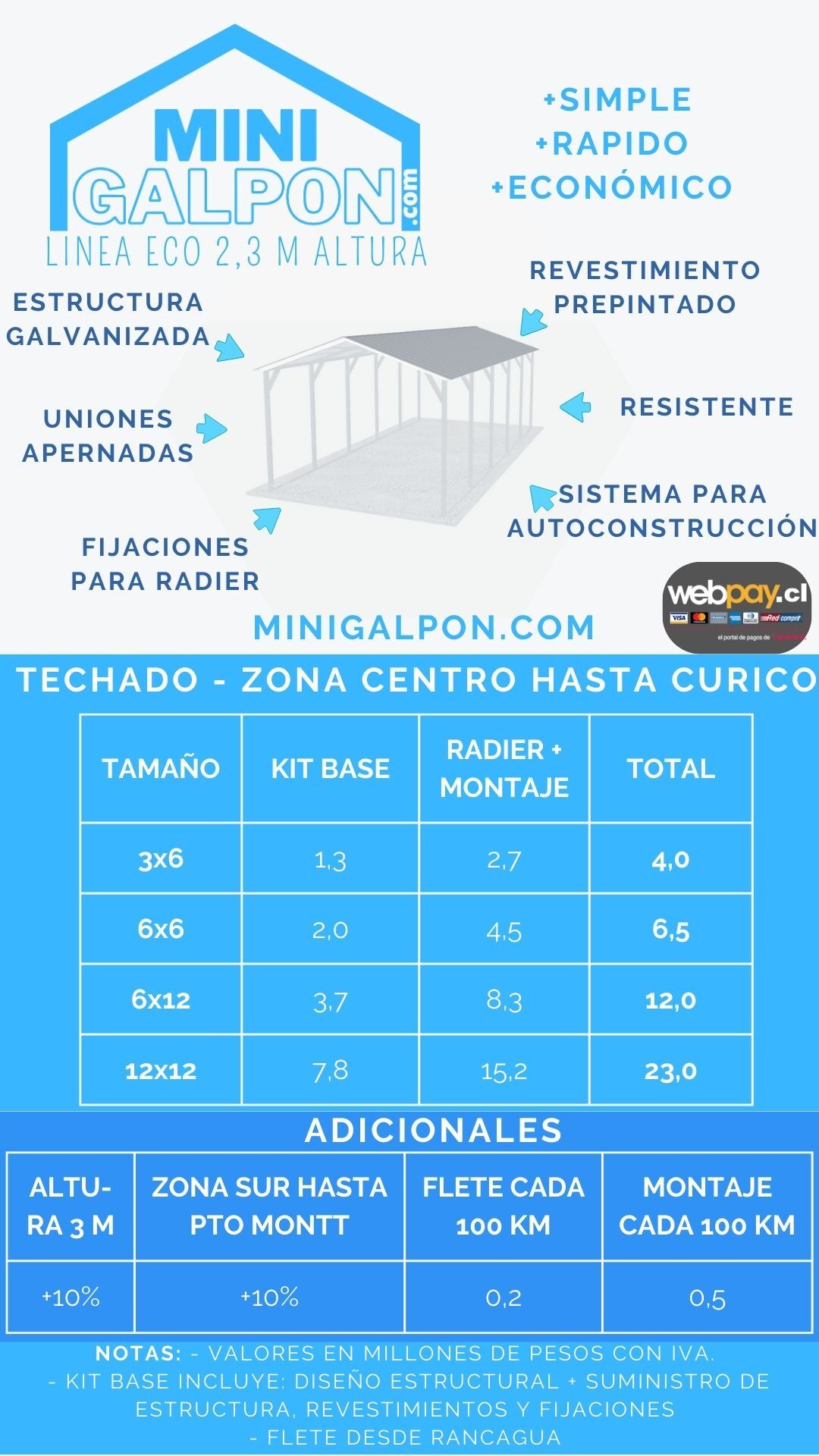 Kit Base Solo Techado, altura 2,3 m, desde $1.300.000 (3x6), hasta $7.800.000 (12x12).