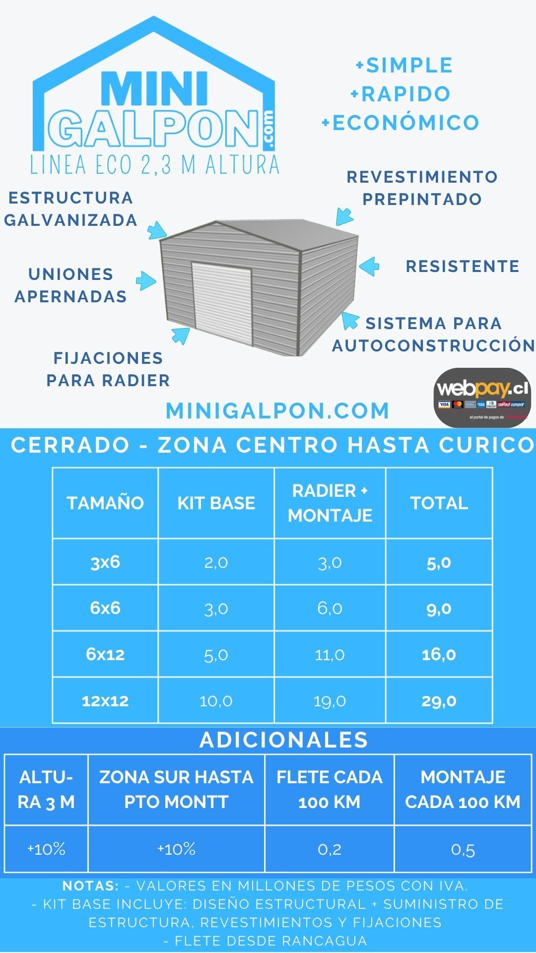 Kit Base Cerrado, altura 2,3 m, desde $2.000.000 (3x6), hasta $10.000.000 (12x12).